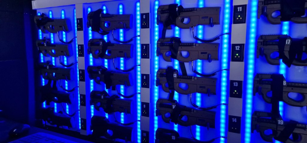 De laser die uit de wapens komt is niet gevaarlijk en door op elkaar te schieten doe je geen pijn.